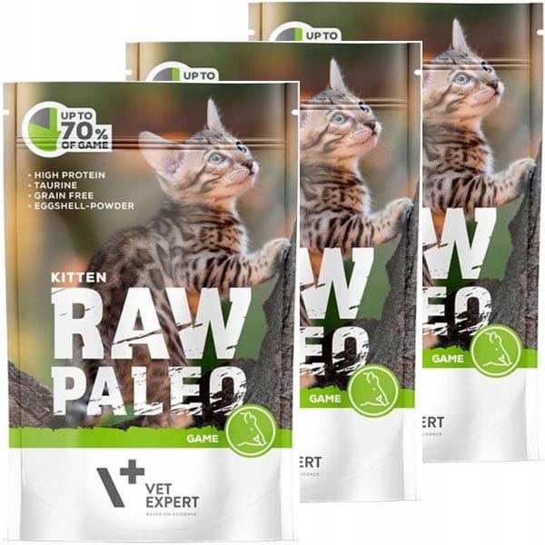 Karma mokra RAW PALEO dla kociąt jest kompletną i zbilansowaną pełnoporcjową karmą bytową przeznaczoną dla kotów rosnących od odsadzenia do ukończenia 1. roku życia.
