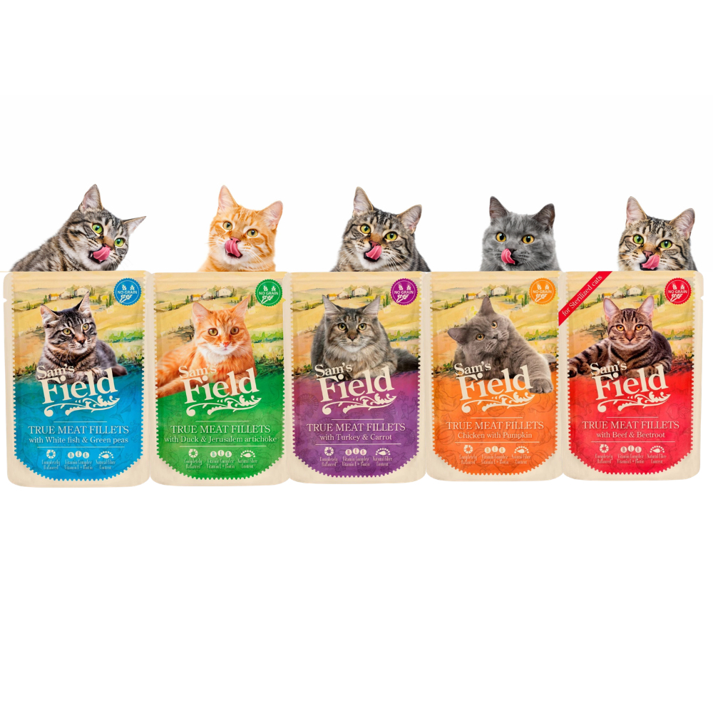 Sam's Field sasz.kot Kurczak z Dynią 3x85g +Sterilized Wołowina Burak 3x85g + Indyk z Marchewką 3x85g +Kaczka z Topinamburem 3x85g+Biała ryba z groszkiem 3x85g
