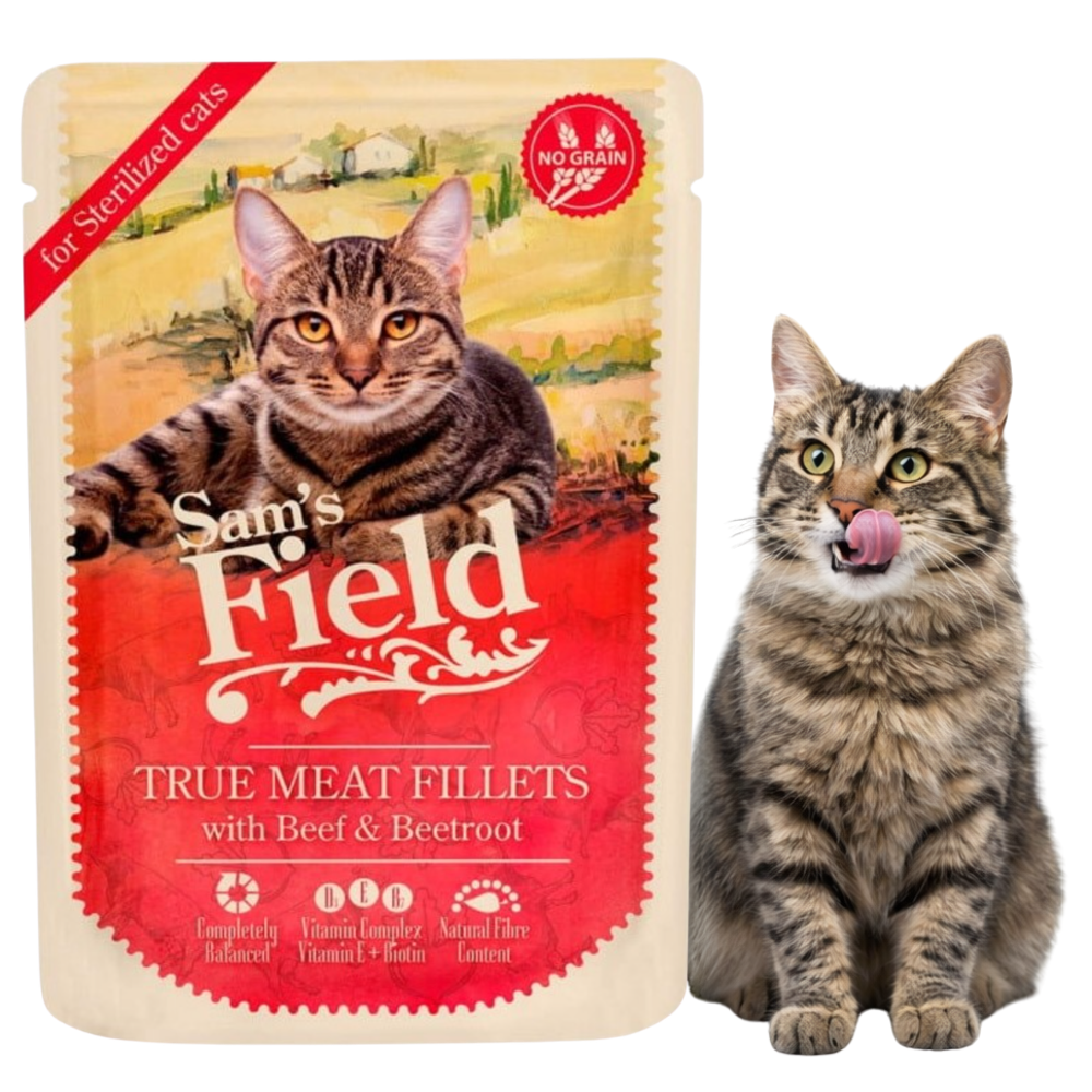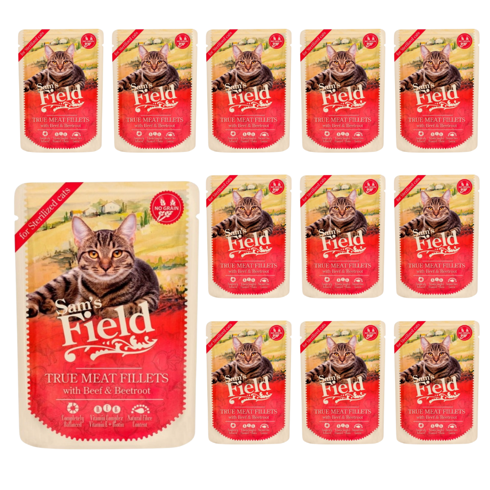 12x Sam's Field True Meat Fillets wołowina z burakiem dla kota sterylizowanego 85g karma mokra