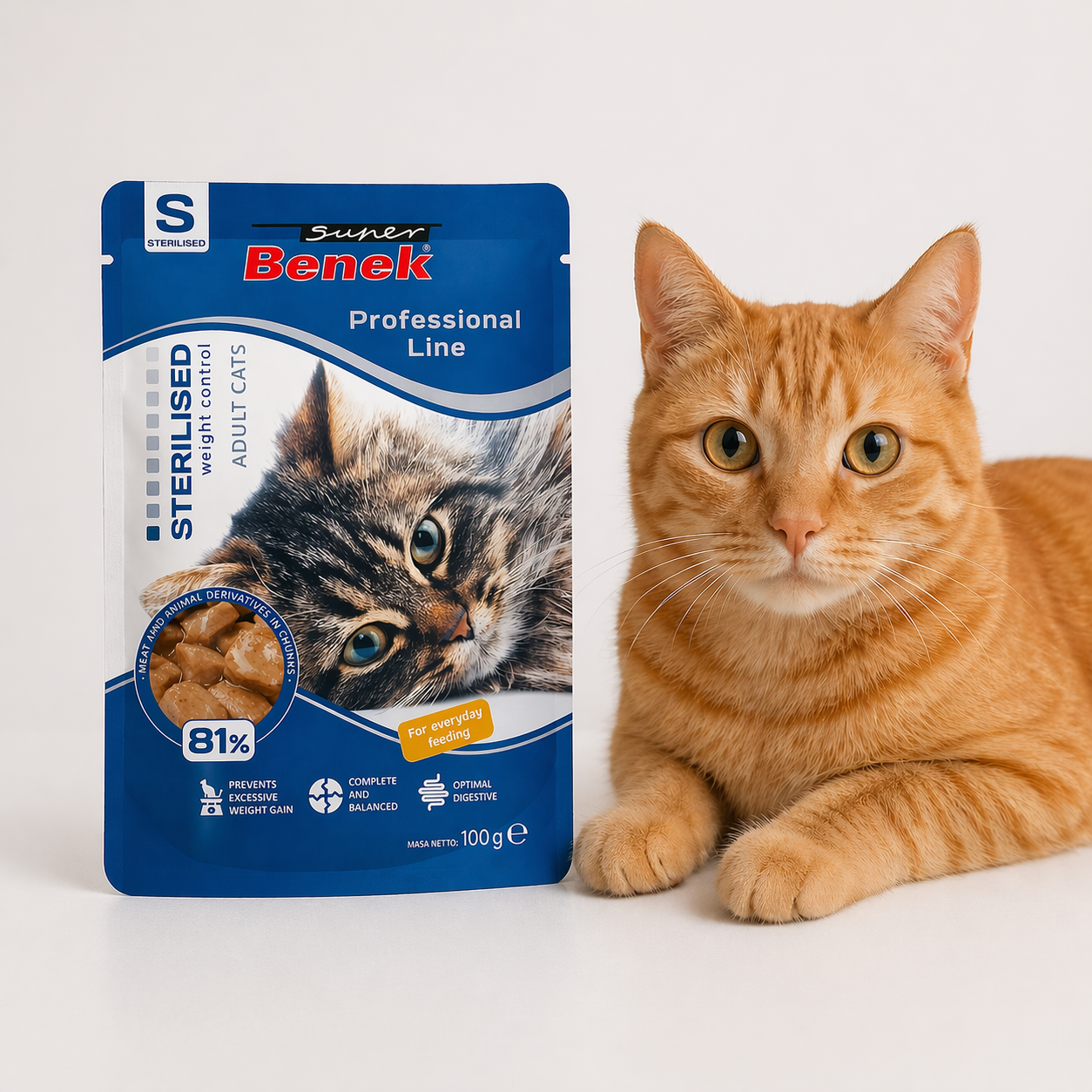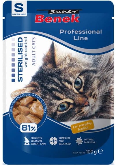 Super Benek Adult Sterilised kurczak to pełnoporcjowa mokra karma dla dorosłych kotów po sterylizacji, stworzona z myślą o codziennym wsparciu prawidłowej masy ciała, dobrego trawienia i ogólnej kondycji mruczka. Smakowite kawałki w sosie sprawiają, że posiłek jest chętnie zjadany, a starannie dobrana receptura odpowiada na potrzeby kotów, których metabolizm po sterylizacji często wyraźnie się zmienia.