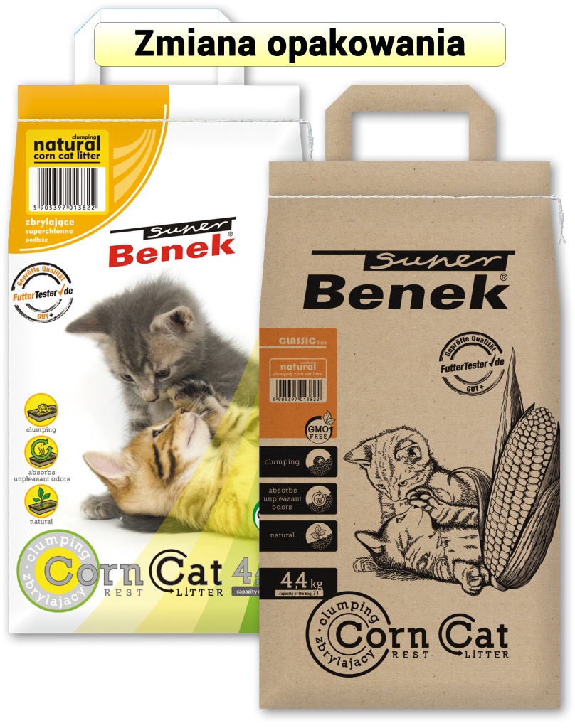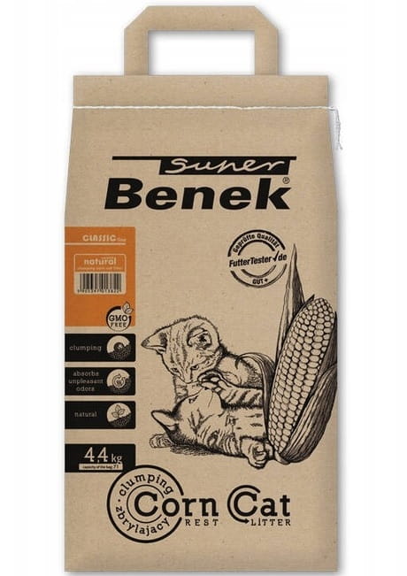 Super Benek Corn Cat Naturalny to idealne podłoże zbrylające dla kotów dorosłych i kociąt a także dla królików, gryzoni i ptaków.