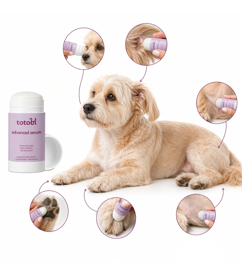 Skóra psa każdego dnia mierzy się z kurzem, suchym powietrzem, wiatrem, nagrzanym podłożem, chłodem i wieloma innymi czynnikami, które mogą prowadzić do przesuszenia, podrażnień i dyskomfortu. To serum zostało stworzone po to, by szybko i skutecznie odpowiadać na te potrzeby. Miękko otula skórę, pomaga odbudować jej naturalne rusztowanie i sprawia, że w dotyku staje się wyraźnie gładsza, bardziej elastyczna i odżywiona.