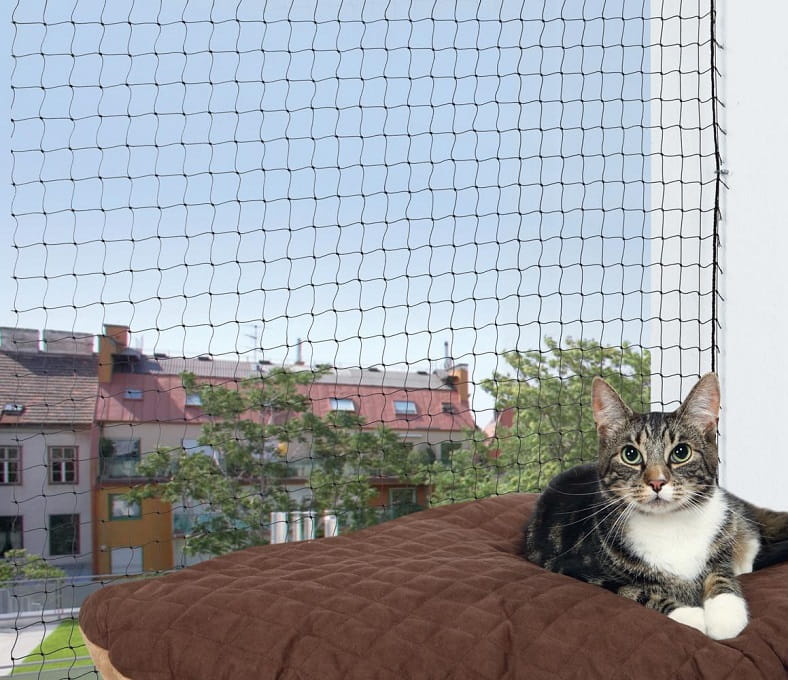 Wytrzymała siatka ochronna przeznaczona do zabezpieczenia balkonu, tarasu lub okien, chroniąca kota przed wypadnięciem i ucieczką.