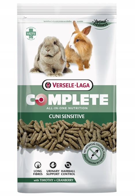Versele-Laga Complete Cuni Sensitive to żywienie bez zmartwień. Niezwykle smaczne ekstrudaty przygotowane wg koncepcji "wszystko w jednym" zapobiegają selektywnemu pobieraniu pokarmu. Dzięki temu Twój królik otrzymuje wszystkie niezbędne substancje odżywcze pozwalając mu cieszyć się pełnią zdrowia. Wysokobłonnikowy pokarm z naturalnymi długimi włóknami roślinnymi pomaga zapobiegać powstawaniu kul włosowych i otyłości. Optymalny poziom wapnia oraz ekstrakt z żurawiny pomaga w utrzymaniu w zdrowiu układu moczowego. Versele-Laga Complete Cuni Sensitive został przygotowany przez lekarzy weterynarii w oparciu o zaawansowane badania.