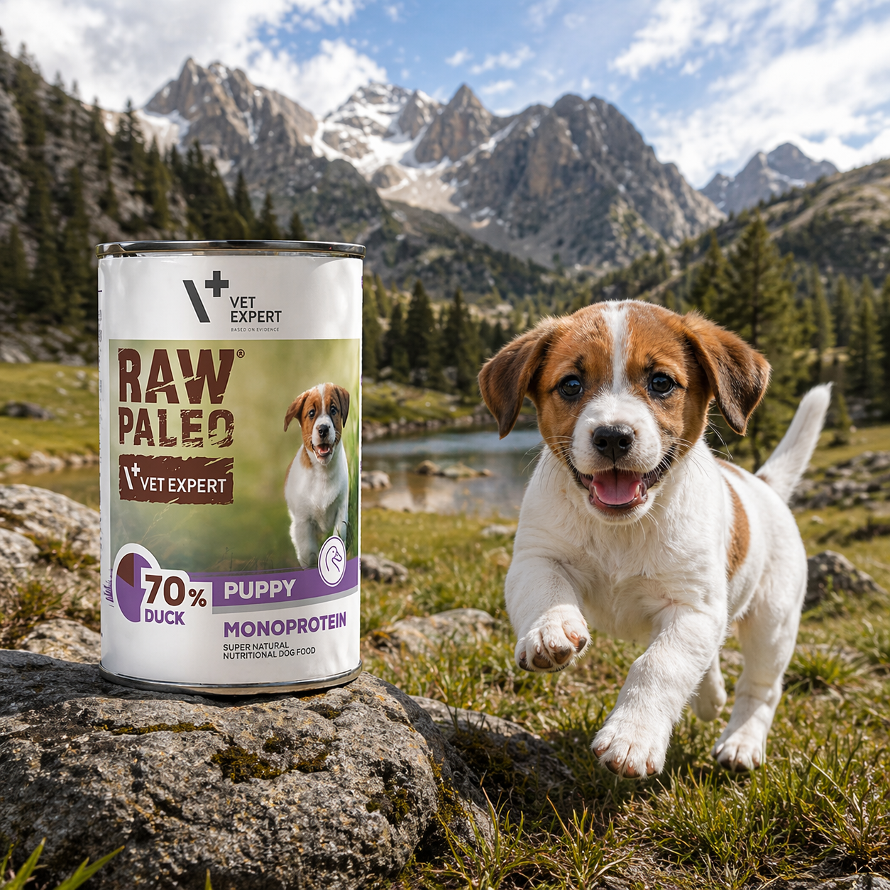 VetExpert Raw Paleo Puppy Monoprotein Duck to pełnoporcjowa mokra karma dla szczeniąt od odsadzenia aż do osiągnięcia dojrzałości. To propozycja dla opiekunów, którzy chcą podawać młodemu psu prosty, mięsny posiłek oparty na jednym źródle białka zwierzęcego. Formuła z kaczką, bez zbóż i bez konserwantów wspiera codzienne żywienie szczenięcia w czasie intensywnego wzrostu, rozwoju i odkrywania świata.