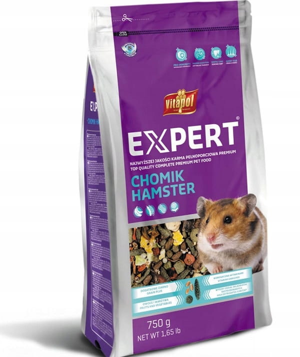 Expert w żywieniu chomików to karma pełnoporcjowa w przewadze skomponowana ze składników poddanych procesowi ekstruzji przez co wszystkie wartościowe składniki żywieniowe są jeszcze bardziej dostępne i przyswajalne przez organizm. Karma ta uzupełniona jest owocami i warzywami poddanymi naturalnym procesom suszenia dla zapewnienia dostępnościo do naturalnych witamin, poprawiająca smak i chęć pobierania pokarmu przez zwierzęta. Ekstrudaty opracowane do wymogów żywieniowych chomików, z odpowiednio dobranym kompleksem witamin i minerałów dla zapewnienia dobrej formy i witalności. Receptura wzbogacona o całe ziarna zbóż i nasion dla zapewnienia odpowiedniego poziomu białka tych wszystkożernych gryzoni. Odpowiednia wielkość i struktura składnikow zachęca do pobierania pokarmu i wpływa pozytywnie na stan siekaczy. Dodatek ziół wspiera procesy trawienne a wyciąg z juki ogranicza nieprzyjmną woń zwierzecych odchopdów.