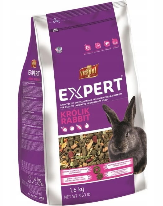 Expert w żywieniu królików to karma pełnoporcjowa w przewadze skomponowana ze składników poddanych procesowi ekstruzji przez co wszystkie wartościowe składniki żywieniowe są jeszcze bardziej dostępne i przyswajalne przez organizm. Karma ta uzupełniona jest owocami i warzywami poddanymi naturalnym procesom suszenia dla zapewnienia dostępnościo do naturalnych witamin, poprawiająca smak i chęć pobierania pokarmu przez zwierzęta. Receptura bez całych ziaren zbóż, a o wysokim udziale włókna surowego dla zapewnienia prawidłowej pracy jelit. Ekstrudowane składniki opracowane według zapotrzebowania żywieniowego roslinożernych królików. Wzbogacone odpowiednim kompleksem witamin dla zapewnienia zdrowego i witalnego organizmu. Udział tymotki i ziół zapewnia optymalne trawienie i sprawia, że karma zyskuje niepowtarzalny, zachęcający smak. Skłądniki z długimi włóknami wzmagają procesy przeżuwania i przyczyniają się do zachowania w zdrowym stanie siekaczy.