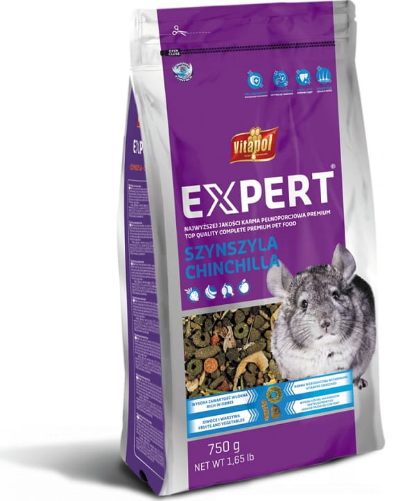 Expert w żywieniu szynszyli to karma pełnoporcjowa w przewadze skomponowana ze składników poddanych procesowi ekstruzji przez co wszystkie wartościowe składniki żywieniowe są jeszcze bardziej dostępne i przyswajalne przez organizm. Karma ta uzupełniona jest owocami i warzywami poddanymi naturalnym procesom suszenia dla zapewnienia dostępnościo do naturalnych witamin, poprawiająca smak i chęć pobierania pokarmu przez zwierzęta. Receptura bez całych ziaren zbóż, o podwyższonym udziale włókna surowego dla zapewnienia prawidłowej pracy jelit. Ekstrudowane składniki opracowane według potrzeb żywieniowych szynszyli, odpowednio witaminizowane i mineralizowane. Z udziałem tymotki i ziół dla prawidłowego trawienia i smakowitości karmy. Składniki z długimi włóknami sprzyjają procesowi ścierania siekaczy.