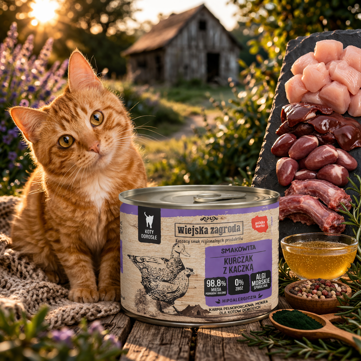 Kot potrzebuje w codziennej diecie przede wszystkim wysokiej jakości składników pochodzenia zwierzęcego. Wiejska Zagroda Kurczak z kaczką odpowiada na te potrzeby, oferując prosty skład bez zbędnych dodatków. To karma, która wspiera zdrowie, witalność i codzienną kondycję kota, a jednocześnie zachwyca smakowitością.