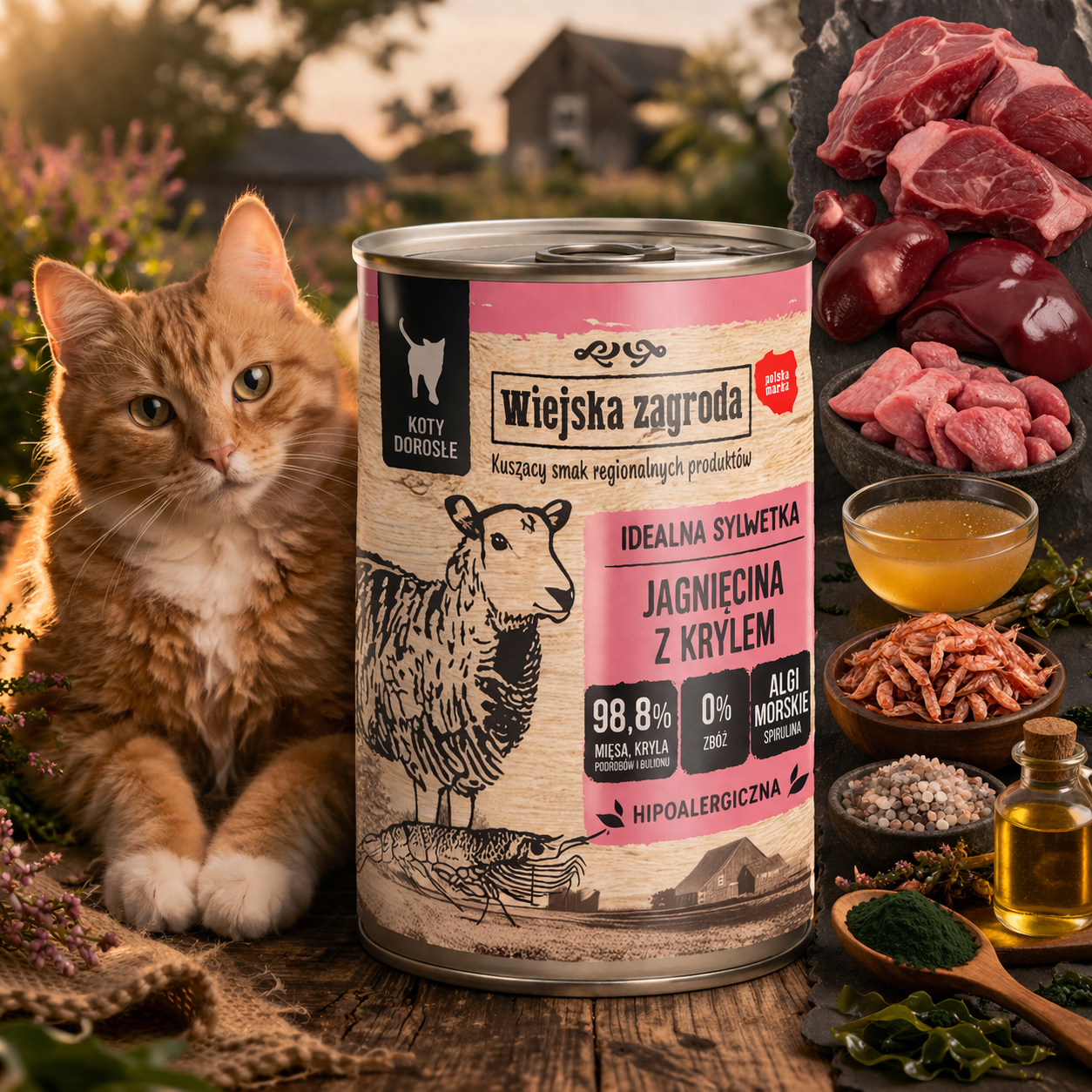 Kot potrzebuje w misce przede wszystkim mięsa oraz dobrze dobranych składników pochodzenia zwierzęcego. Wiejska Zagroda Kot Jagnięcina z krylem odpowiada na te potrzeby, oferując prosty skład bez zbędnych dodatków. To karma, która wspiera zdrowie, witalność i codzienną kondycję kota, a jednocześnie zachwyca smakowitością.