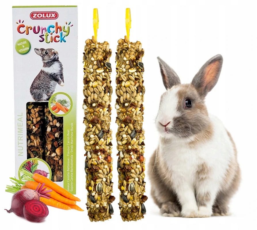 Zolux Crunchy Stick marchew i burak to przepyszny pokarm dodatkowy dla królików, który łączy naturalny skład, chrupiącą formę i smakowite dodatki uwielbiane przez uszate pupile. To przysmak opracowany z myślą o specyficznych potrzebach królików, który nie tylko sprawia przyjemność, ale też daje zwierzakowi zajęcie i wspiera naturalne ścieranie zębów. Marchew i burak tworzą wyjątkowo apetyczne połączenie, które pięknie urozmaica codzienną dietę.