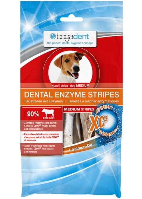 Wyjątkowo smaczna skóra wołowa z bogadent® DENTAL ENZYME STRIPES myje zęby twojego psa, podczas gdy on szczęśliwie żuje.